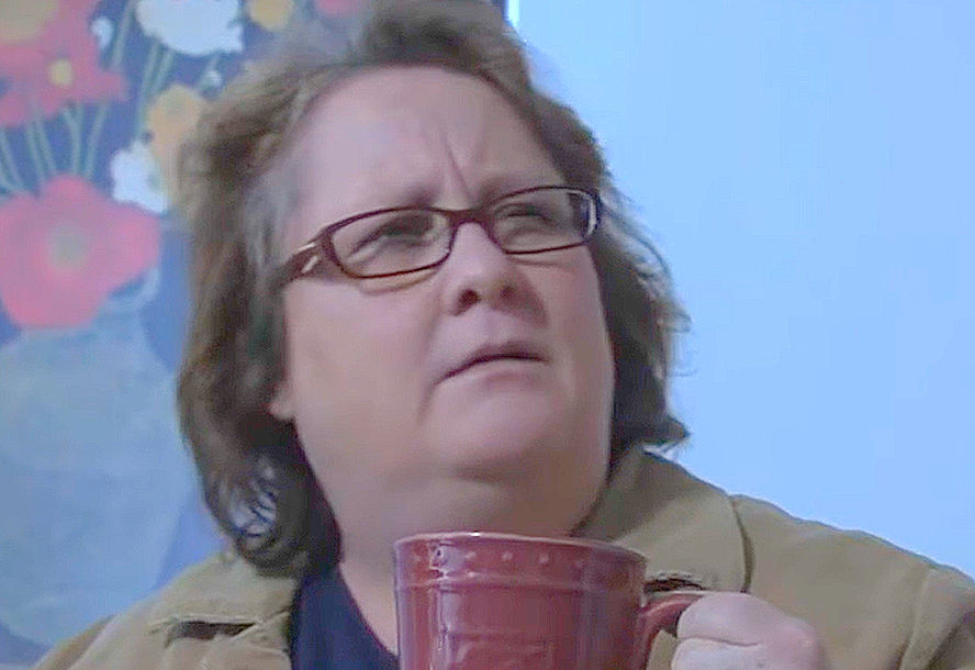 (ID: Patrick Seitz in a blue polo & Erin Fitzgerald in a pink tank and gold sweater look shocked.)